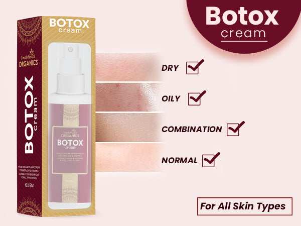 Simply Herbal Organics Botox Cream is a Unique Formulation That Proves to Be a Safe, Effective, and Painless Alternative for Botox Treatment as This Special Formula Contains a Variety of Highly Specialized Ingredients Such as Blady Grass Extract & Grape Seed Extract in Addition to Vitamin C & E That Helps to Reduce the Appearance of Wrinkles and Brightens Up the Skin to Give Your Face a Lifted and Healthy Look and Feel. This Cream Reduces the Signs of Aging by Supporting Skin Cell Turnover, Improving Fine Lines and Filling Skin Creases, and Improving Epidermal Barrier and Facial Elasticity.