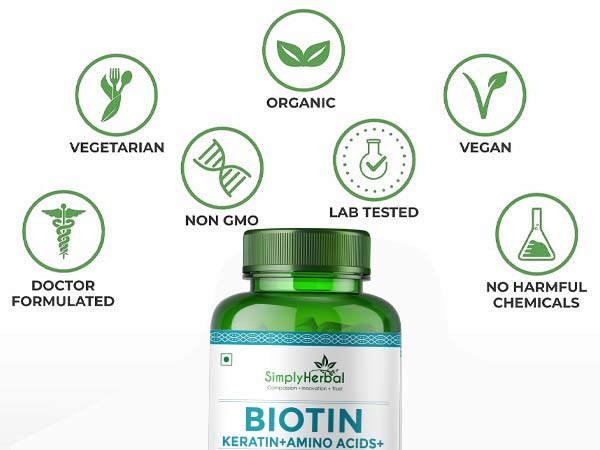 Amino acids serve as the fundamental building blocks of proteins, which play a critical role in maintaining the structure and functionality of hair, skin, and nails. The Simply Herbal Natural Biotin Vitamin B7 Capsules are enriched with a unique blend of amino acids, carefully formulated to support the body's natural processes and enhance the health of your hair and skin.