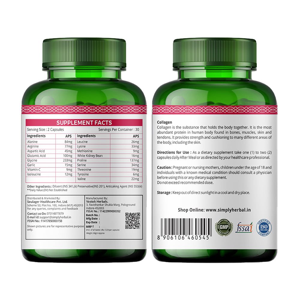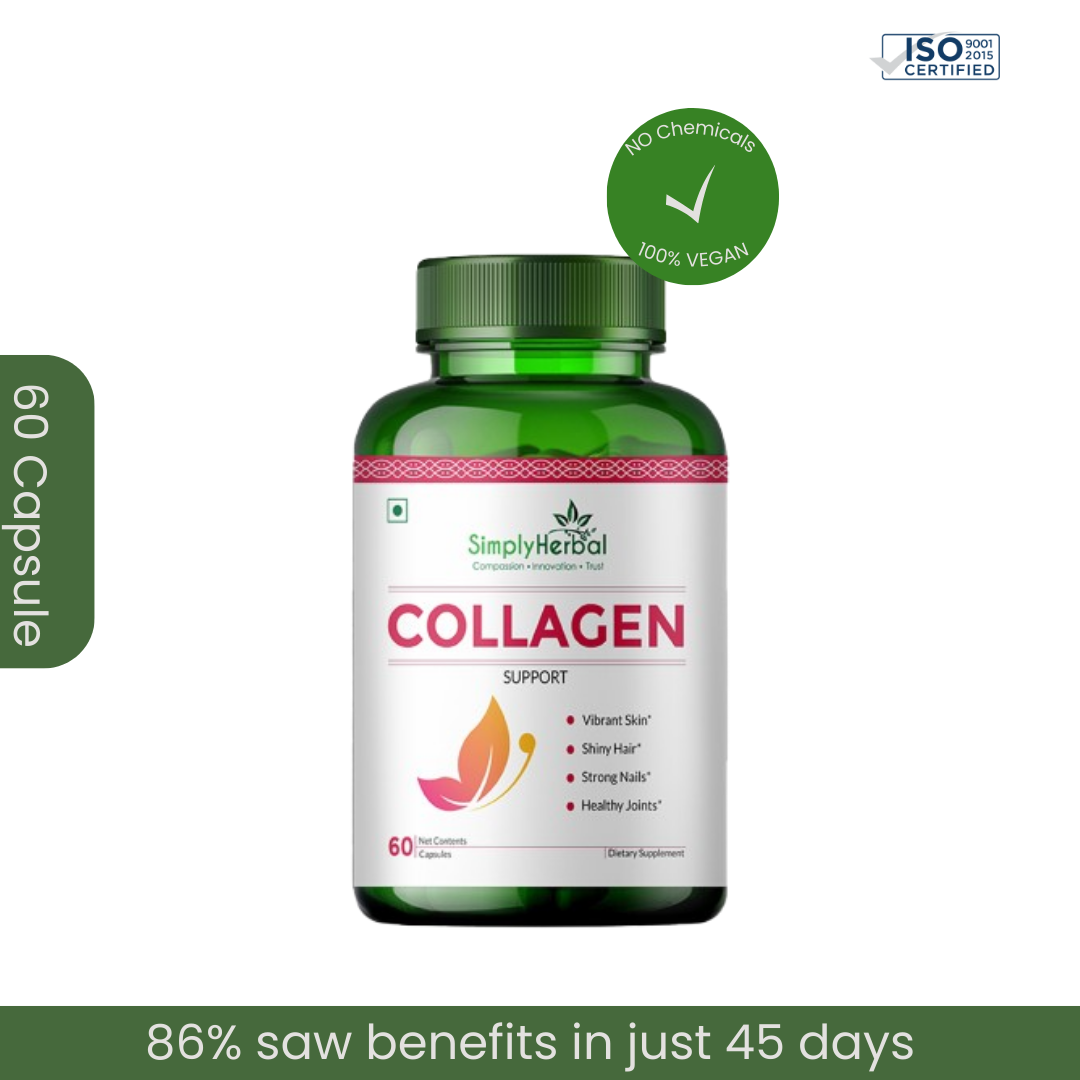 Welcome to Simply Herbal, your hub for holistic well-being! Our Plant-Based Collagen Builder Capsules and Gummies, enriched with Vitamin C and White Kidney Beans, provide a natural solution for healthier hair, radiant skin, stronger nails, and fortified bones and joints. Illuminate your inner beauty and elevate your vitality with our 60 Veg Capsules & 30 Gummies, blending nature and science. Prioritize your well-being and embark on a journey to a healthier, more radiant you with Simply Herbal today!