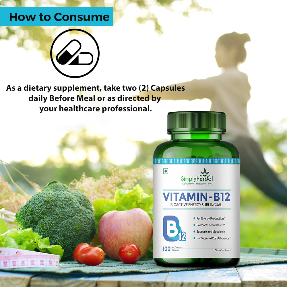 Consume One Capsule of Simply Herbal Vitamin B12 Daily With Water, Preferably During a Meal. Adhere to the Recommended Dosage and Avoid Exceeding the Daily Intake. Make It a Part of Your Daily Routine to Effectively Support Red Blood Cell Production, Maintain Good Health, Boost Energy, and Promote Heart Health.